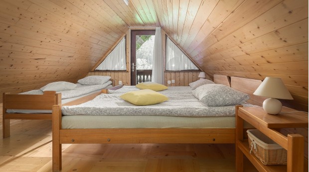Im Erdgeschoss sind die Küche mit Essbereich, wo man auch die Möglichkeit hat, mit einem Holzofen zu heizen, sowie das Badezimmer. Im Dachgeschoss befinden sich zwei Schlafzimmer, eines mit Doppelbett und das andere mit Doppel- und Einzelbett. Die Gesamtfläche beträgt 80 m2. Am Haus gibt es eine Terrasse mit Esstisch und einen gepflegten Garten mit Grillplatz.