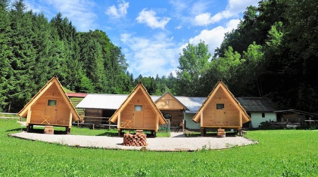 Attractive wooden cabins on a green meadow and in the forest on the edge of the village of Kamna Gorica.