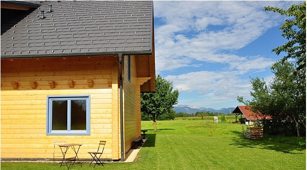 This new wooden house in the countryside has a well-appointed main room and a separate bathroom.