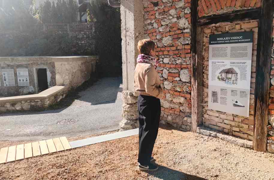Continue past the park towards the part of Kropa called Kotel. Walk past the garages to reach a bridge. Cross the bridge to arrive in the area of the Kotel Learning Park. Take time to see part of the former Matiček House, the Bodlaj vigenjc nail-making workshop, and the walls of a former distillery. The outdoor exhibition presents the architecture of Kropa houses and the area as it once was, while interactive points invite children to take part in activities.