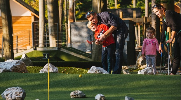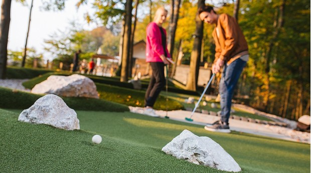 Adventure Mini Golf is the only mini golf course in Slovenia that offers a complete experience. Play takes place on artificial grass with the gentle sounds of a stream, waterfall and fountain.