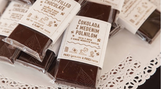 Eat the chocolate and plant the paper. A chocolate bar filled with certified Slovenian honey wrapped in biodegradable paper made from the seeds of honey plants.