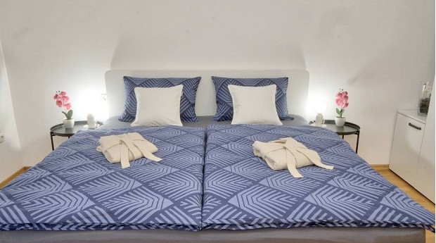 Al primo piano ha luogo un alloggio composto da una cucina con zona pranzo, un soggiorno con letti supplementari e accesso al balcone, una camera con un ampio letto matrimoniale e un bagno. Gli ospiti hanno a disposizione tutti gli utensili da cucina necessari, asciugamani e accappatoi. L'alloggio è inoltre dotato di aria condizionata e riscaldamento in ogni stanza e di un televisore.