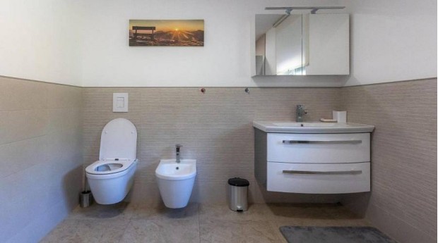 L'ampio bagno con doccia a soffitto, parete doccia a specchio, lavatrice-asciugatrice, bidet e altri servizi essenziali vi offrirà tutto il necessario per un soggiorno tranquillo e anche per soggiorni prolungati.
