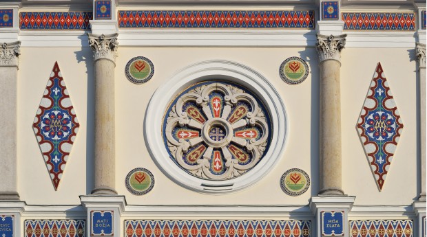 La facciata è riccamente decorata con simboli a mosaico, iscrizioni, rosoni e altre decorazioni artistiche, secondo i progetti del famoso architetto sloveno Ivan Vurnik. Tra due colonne semicircolari di marmo rosso, si inserisce la porta a due battenti riccamente decorata. Sul battente destro sono scolpite dal basso in alto le immagini dei profeti che predissero la nascita di Maria: Mosè, David e Isaia. Su quello sinistro sono raffigurate le matriarche Sara, Rachele e Giuditta.