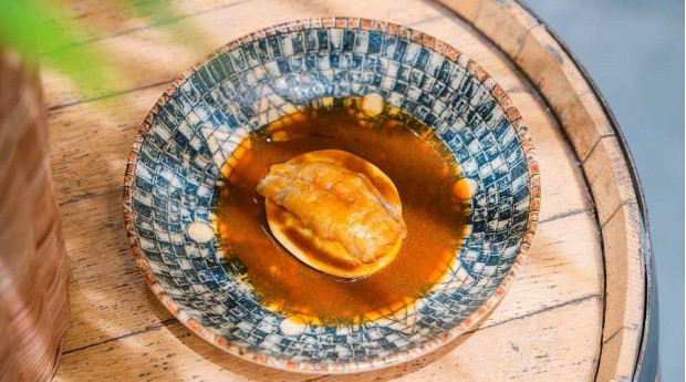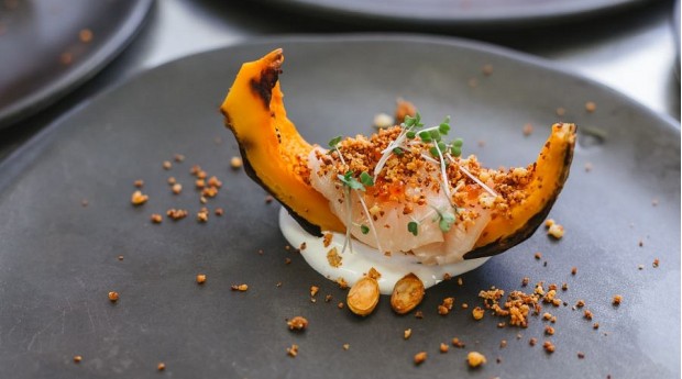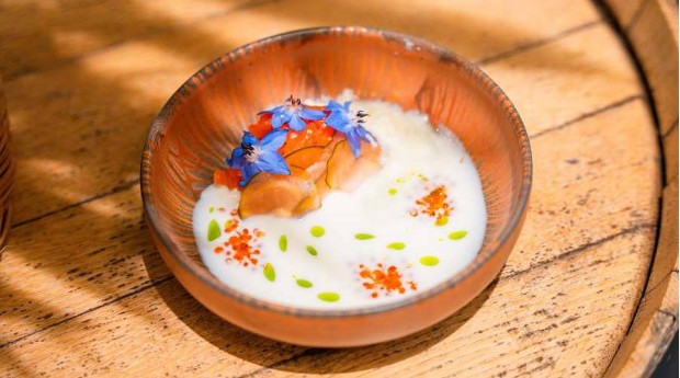 Bogatajeva skuta s hrenom, hladno dimljena Bohinjska Zlatovčica, limonino olje, čemažev cvet