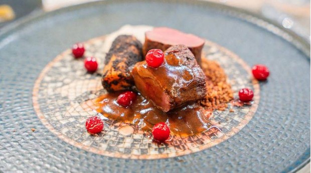 Rezine telečjega hrbta, redukcija vipavskega merlota, gomolj zelene in kolerabe, pire korenčka in graha, jurčkov crumble