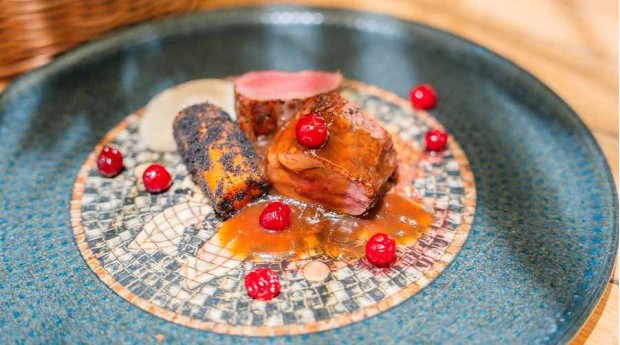 pečeni pastinak, sirni cmok, omaka smrekovih vršičkov, jerebika