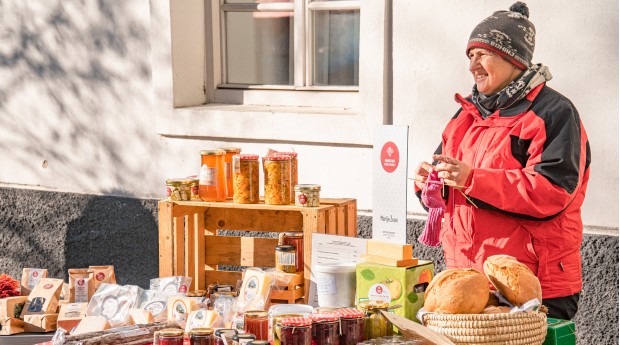 Ponudba: domači kruh, suho sadje, koruzna moka, kokošja jajca talne reje, izdelki iz ovčje volne
