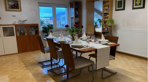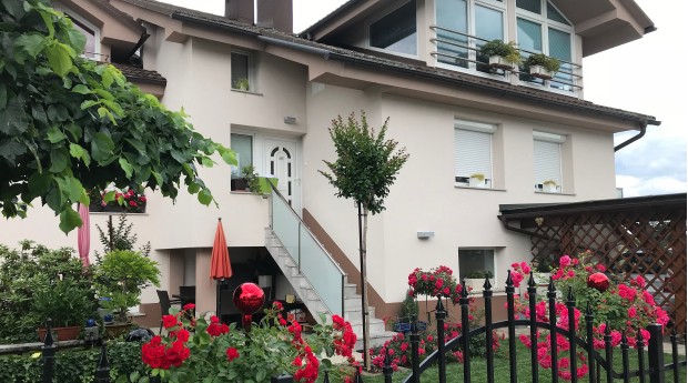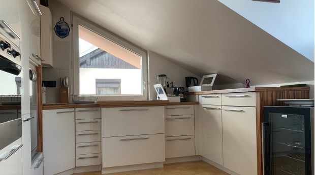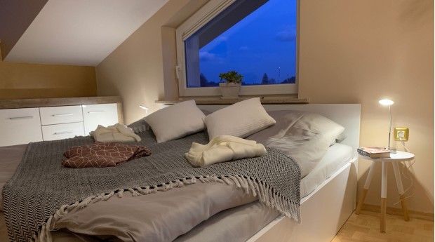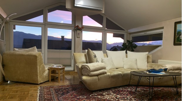 Prostoren, svetel in lepo opremljen apartma se nahaja v mansardi stanovanjske hiše v Radovljici.