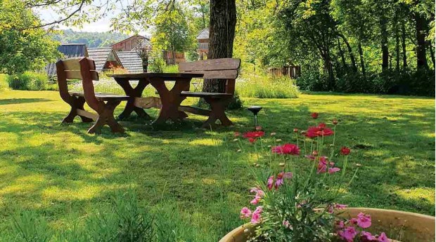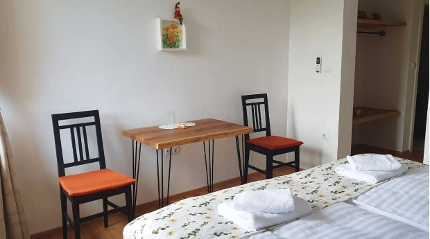 Sobe so opremljene v naravnem lesu Slovenskega hrasta in oreha naše tete Majde, ena od sob in jedilnica sta opremljeni s prenovljenim pohištvom našega pradedka Ludvika, ravno tako vsi stoli in fotelji, ki so naša družinska dediščina.