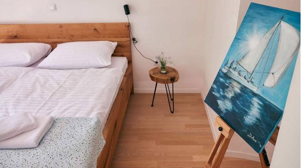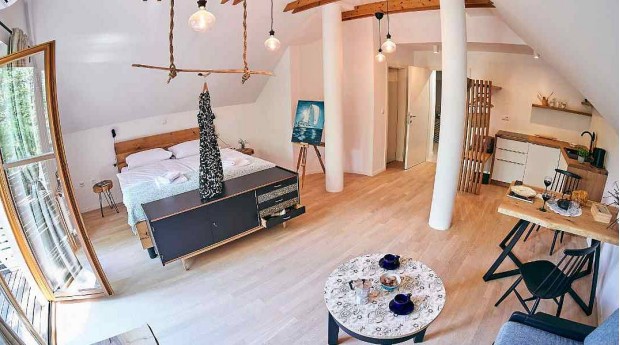 V naši družinski hiši, ki se nahaja neposredno ob reki Savi v bližini sotočja reke Save Bohinjke in Save Dolinke, nudimo v mansardi komfortno in prijetno urejenih 5 dvoposteljnih sob s kopalnico in 1 studio (2+2 os), ki ima poleg kopalnice tudi manjšo opremljeno kuhinjo. Vsaka soba ima balkon, kjer boste obdarovani s čudovitimi pogledi na naš vrt, reko Savo, najvišjo goro Triglav in staro mestno jedro Radovljice.
